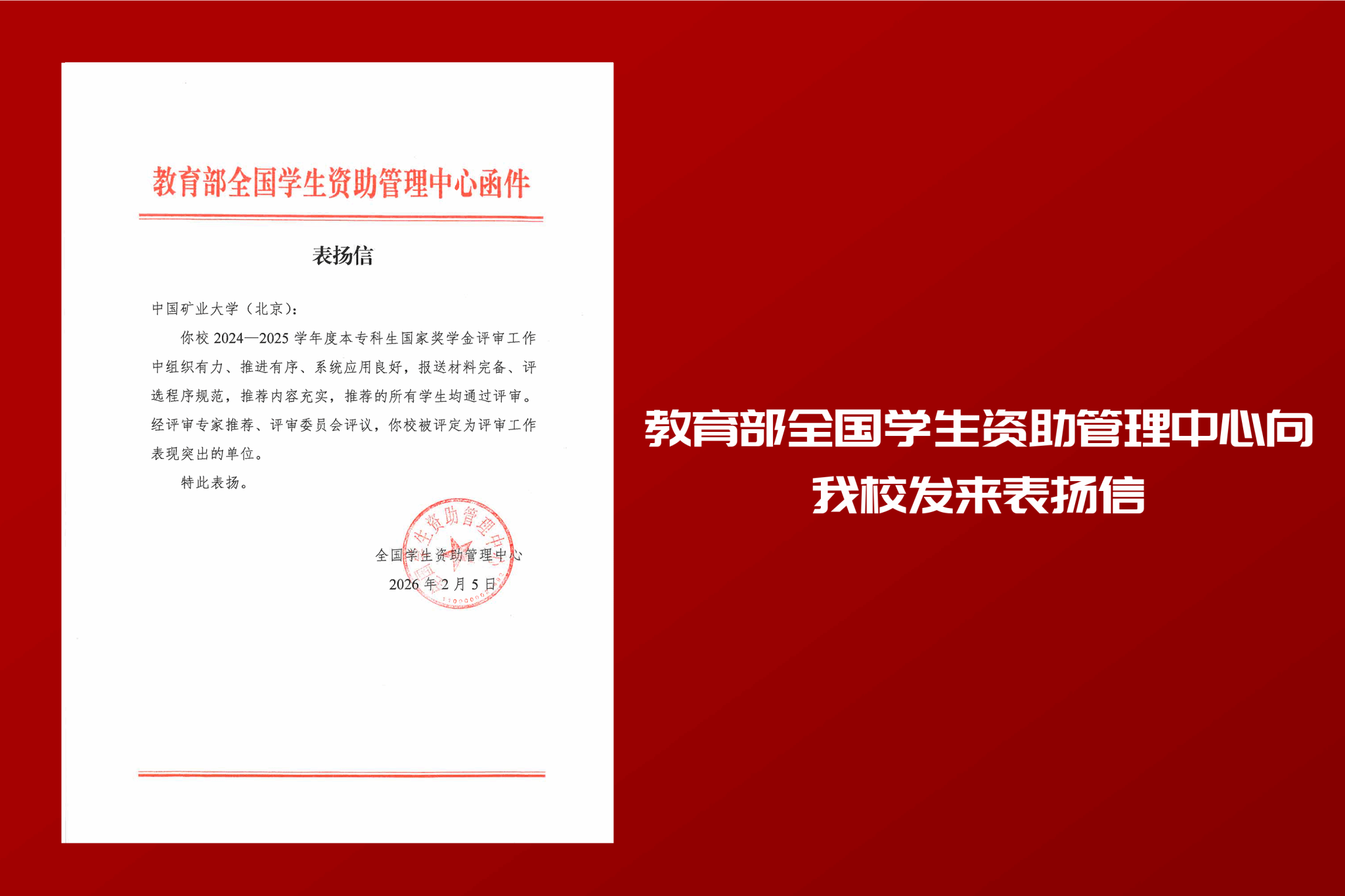 2月5日,教育部全国学生资助管理中心向学校发来表扬信,对学校2024—2025学年度本专科生国家奖学金评审工作给予高度肯定,并将我校评定为评审工作表现突出单位,这是对学校规范开展学生资助评审工作、坚守公平公正原则的充分认可。为扎实做好2024—2025学年国家奖学金和国家励志奖学金评审工作,2025年9月—10月,学校在学生工作指导委员会的领导下,严格依据上级文件精神,下发《中国矿业大学(北京)关于做好2024—2025学年本...