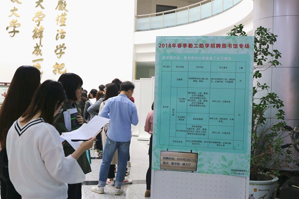 3月27日下午,学校举行2018年春季勤工助学图书馆专场招聘会,招聘会在图书馆一层大厅举行。