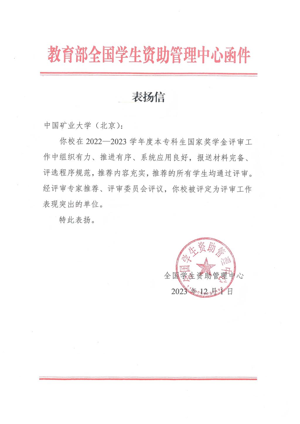 表扬信中指出,我校在2022—2023学年度本专科生国家奖学金评审工作中组织有力、推进有序、系统应用良好,报送材料完备、评选程序规范,推荐内容充实,推荐的所有学生均通过评审。经评审专家推荐、评审委员会评议,学校被评定为评审工作表现突出的单位。
