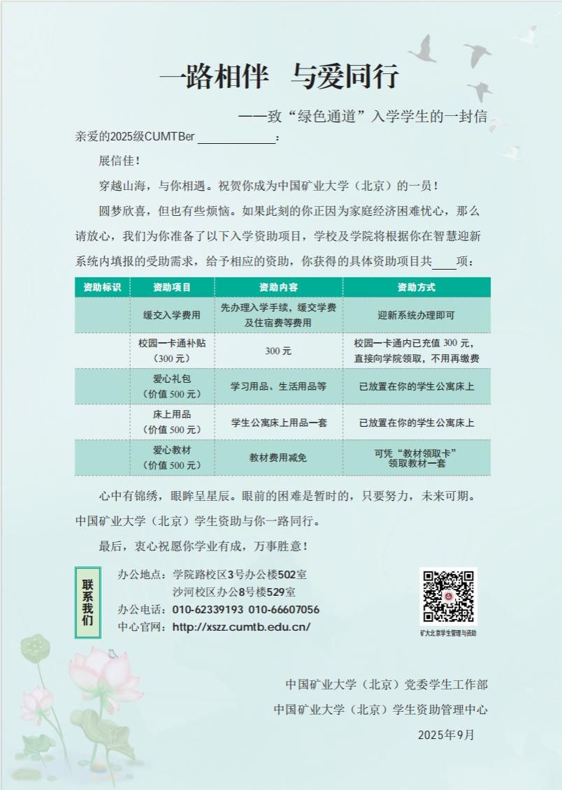 中国矿业大学(北京)以精准研判学生需求、激励学生成长成才为工作目标,在充分保护学生隐私的工作前提下,广泛宣传资助政策、个性定制资助礼包,新生入学“绿色通道”全程线上办公、所有资助物资在学生报到前已配送到床位,为家庭经济困难新生带去暖心服务、无声关爱,确保每一位新生都能顺利入学。