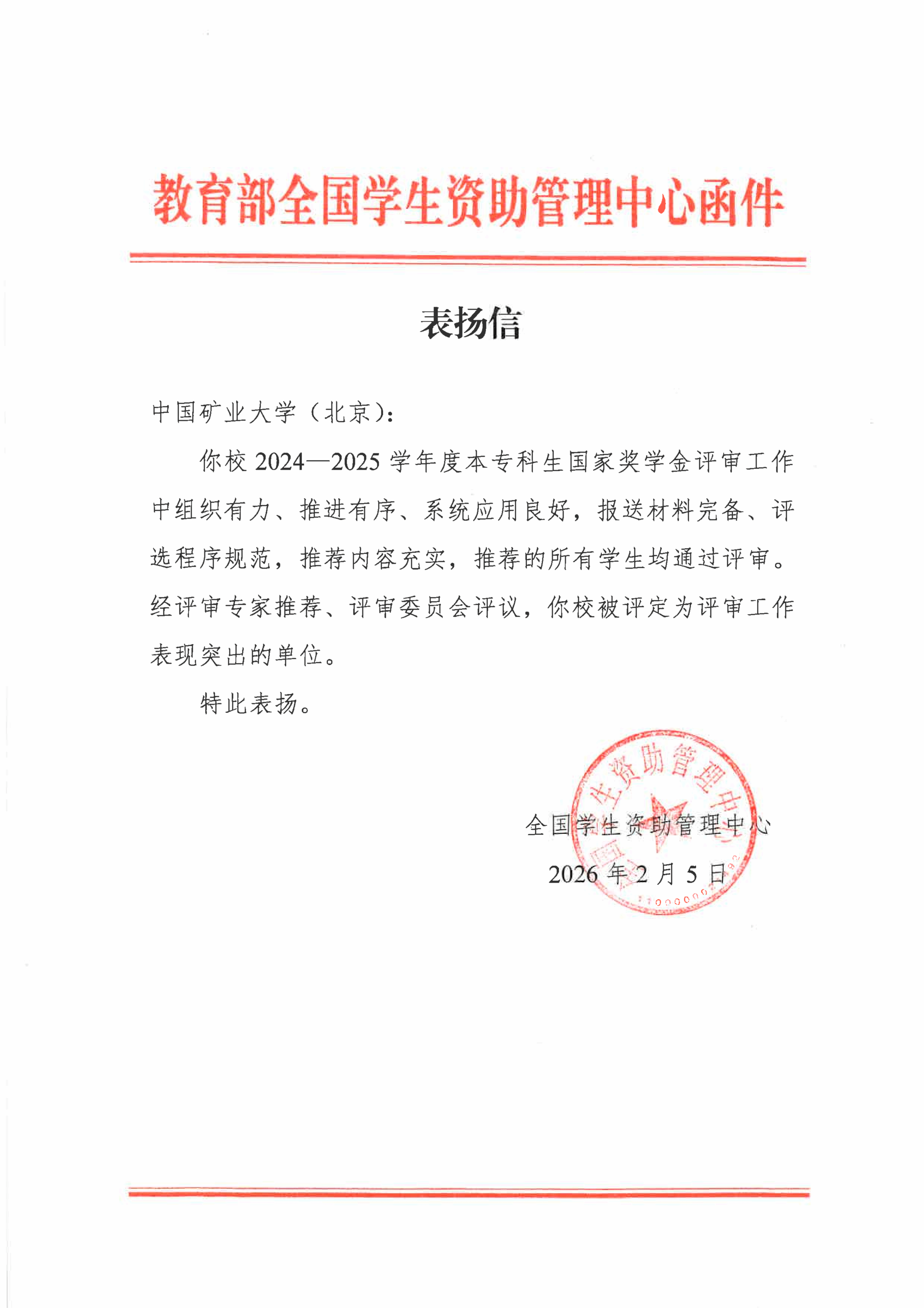2月5日,教育部全国学生资助管理中心向学校发来表扬信,对学校2024—2025学年度本专科生国家奖学金评审工作给予高度肯定,并将我校评定为评审工作表现突出单位,这是对学校规范开展学生资助评审工作、坚守公平公正原则的充分认可。